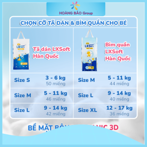 Tã dán / tã quần LXSoft là dòng sản phẩm chăm sóc em bé được nhập khẩu chính hãng từ Hàn Quốc. Với bề mặt bằng bông hữu cơ 3D, lõi thấm hút 2 lớp chứa các hạt thấm hút thông minh hút thấm tới 500ml, tã dán/ tã quần cao cấp LxSoft siêu mềm mại, thấm hút và chống tràn hoàn hảo và ngừa hăm toàn diện cho phép bé vận động thỏa mái và có được giấc ngủ ngon.